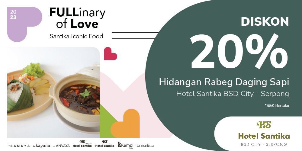 Hotel Santika BSD City – Serpong ikut serta pada Santika Iconic Food tahun 2023 dengan membawa menu makanan khas kota Serang provinsi Banten. Menu Rabeg Daging Sapi memiliki rasa khas nya sendiri, yakni perpaduan rasa gurih manis serta rasa pekat dari rempah pilihan, sehingga sangat cocok dengan selera masyarakat Indonesia. Selain menu makanan, Hotel Santika BSD City – Serpong juga menyediakan menu minuman, Ginger Coffee menjadi pilihan dengan komposisi Jahe dan kopi yang bermanfaat untuk melancarkan peredaran darah sehingga mengonsumsi keduanya akan memaksimalkan khasiat tersebut. Dapatkan diskon untuk kedua menu tersebut sebesar 20% pada aplikasi My Value.
