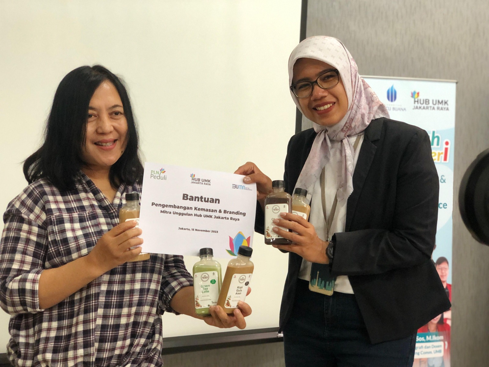 Bantuan pengembangan branding kemasan diserahkan oleh Manager Komunikasi dan TJSL PLN Unit Induk Distribusi Jakarta Raya, Pandu Prastyani.