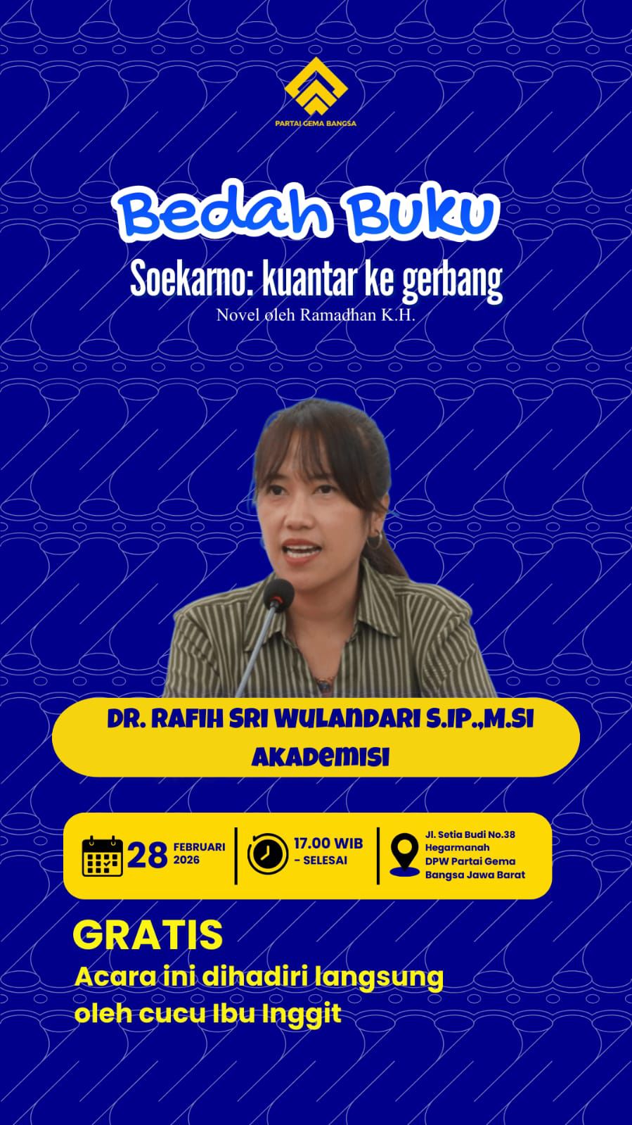 Bandung, 28 Februari 2026 — Dewan Pimpinan Wilayah Partai Gema Bangsa Jawa Barat menyelenggarakan kegiatan Bedah Buku novel “Soekarno: Kuantar ke Gerbang” karya Ramadhan K.H. pada Jumat, 28 Februari 2026 pukul 17.00 WIB hingga selesai, bertempat di Jl. Setia Budi No.38, Hegarmanah, Bandung.