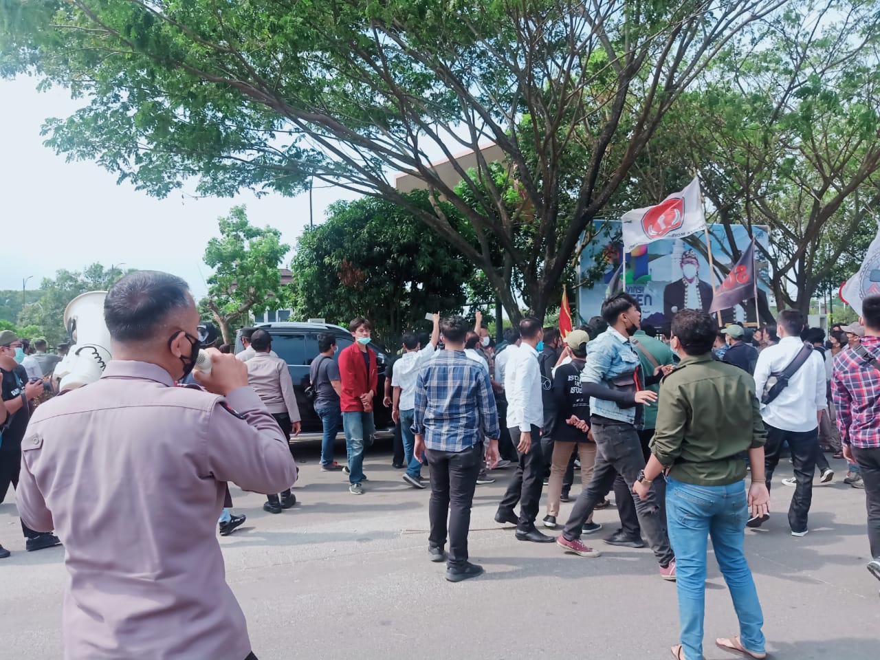Kabid Humas Polda Banten saat pelaksanaan unjuk rasa menghimbau kepada seluruh mahasiswa yang melakukan unjuk rasa melaksanakan aksi dengan tertib dan damai.