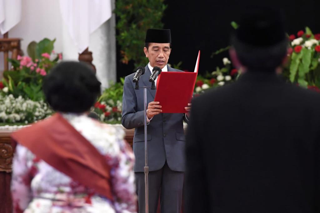 “Bahwa saya akan setia kepada Undang-Undang Dasar Negara Republik Indonesia Tahun 1945 serta akan menjalankan segala peraturan perundang-undangan dengan selurus-lurusnya demi darmabakti saya kepada bangsa dan negara. Bahwa saya dalam menjalankan tugas jabatan akan menjunjung tinggi etika jabatan, bekerja dengan sebaik-baiknya, dengan penuh rasa tanggung jawab,” ujar Presiden mendiktekan penggalan sumpah jabatan.