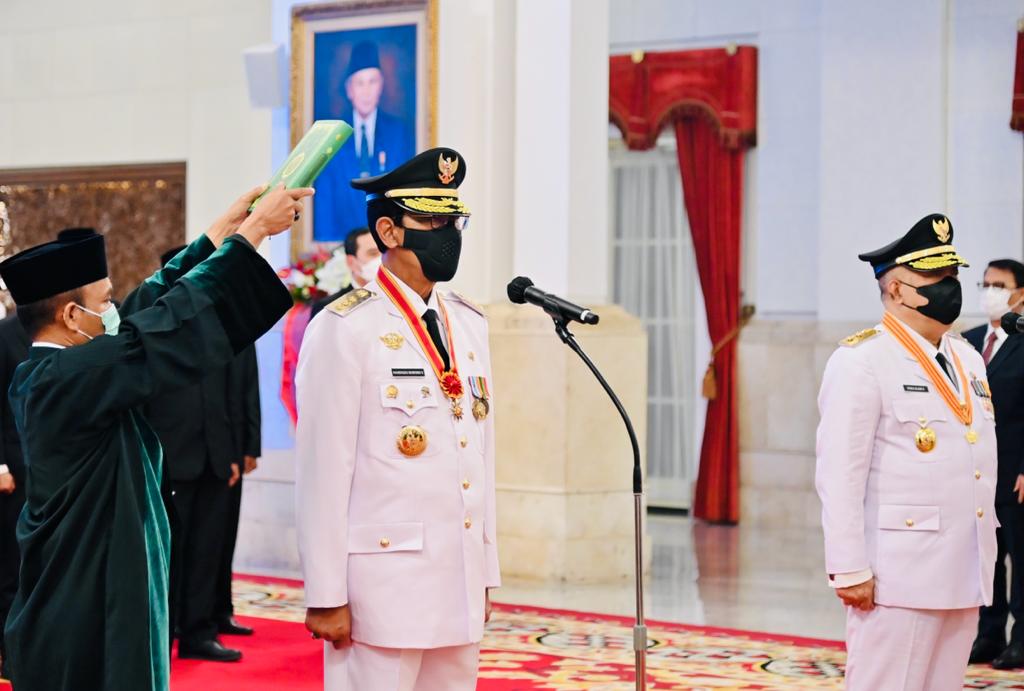 “Saya bersumpah akan memenuhi kewajiban saya sebagai gubernur/wakil gubernur dengan sebaik-baiknya dan seadil-adilnya, memegang teguh Undang-Undang Dasar Negara Republik Indonesia tahun 1945 dan menjalankan segala undang-undang, dan peraturannya dengan selurus-lurusnya, serta berbakti kepada masyarakat, nusa, dan bangsa,” ucap Presiden mendiktekan penggalan sumpah jabatan.