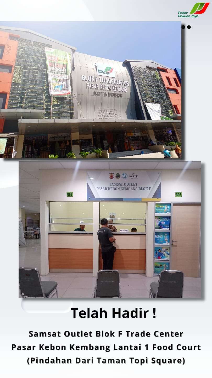 Kini, membayar pajak kendaraan bisa dilakukan di Blok F Trade Center, Pasar Kebon Kembang lantai 1 food court di Jalan Dewi Sartika No.73, RT.04/RW.06, Pabaton, Kecamatan Bogor Tengah, Kota Bogor.