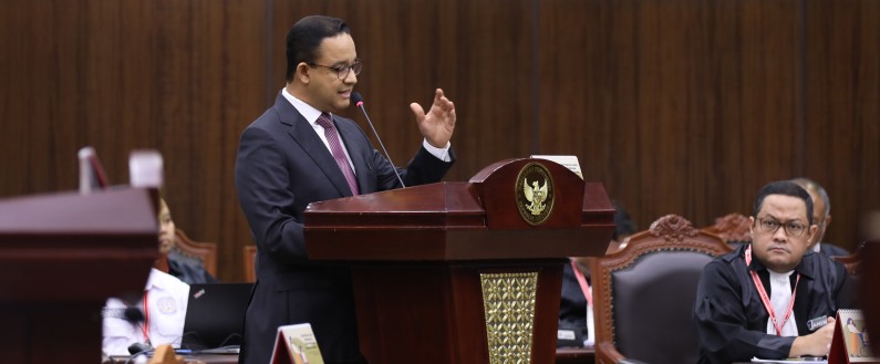 Di hadapan sidang yang dipimpin Ketua MK Suhartoyo dengan didampingi tujuh hakim konstitusi lainnya, Anies mengatakan, Pilpres 2024 tidak berjalan secara bebas, jujur, dan adil.
